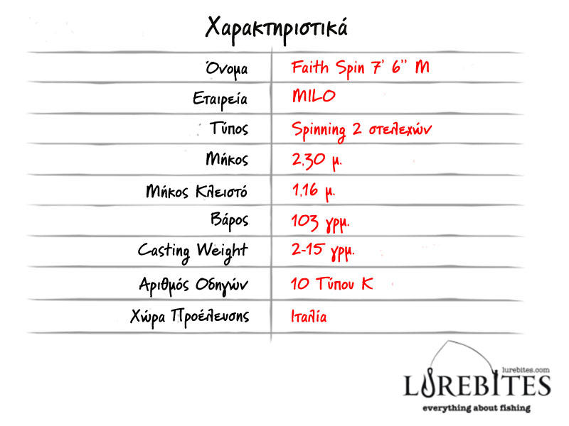 Η ιταλική εταιρεία Milo έχει μπει δυναμικά το 2016 στον κόσμο του spinning. Μια από τις προτάσεις της είναι μια όμορφη και πολλά υποσχόμενη σειρά καλαμιών που απευθύνεται στο LRF & HRF, την σειρά Faith Spin. Σε αυτή την δοκιμή από αυτή τη σειρά, διαλέξαμε το Faith Spin 7'6" Μ το οποίο έχει medium δράση, δίνοντας έτσι μια λύση σε όποιον θέλει να ασχοληθεί με το HRF το οποίο έχει γίνει πλέον αρκετά γνωστό στην χώρα μας και έχει στρέψει τα βλέμματα πάνω του.