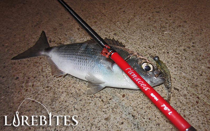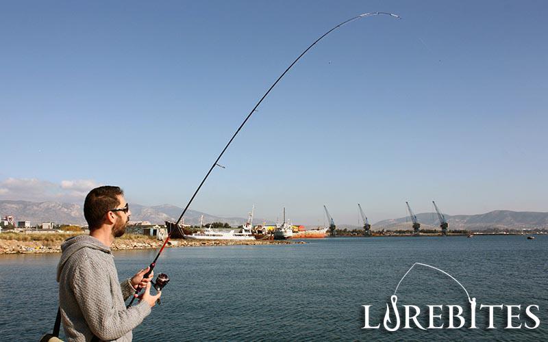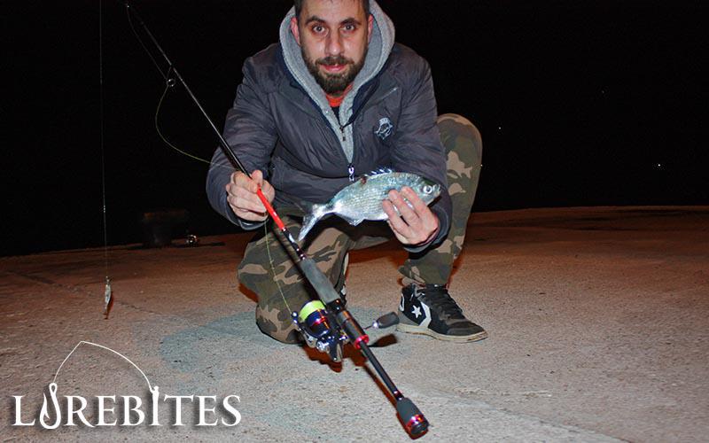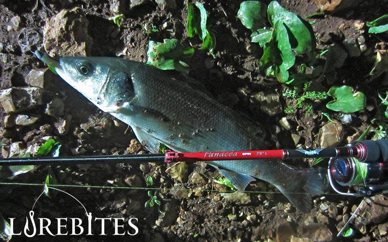 Φτάνοντας μεσημέρι στο κοντινό λιμανάκι της περιοχής μου άνοιξα το καπό του αυτοκινήτου για να βγάλω την φωτογραφική μηχανή και κάποια άλλα προϊόντα που είχα για φωτογράφηση. Ξάφνου άκουσα ψιλό να πηδάει τρομαγμένο δίπλα μου και γυρίζοντας το κεφάλι προς την θάλασσα, είδα το χτύπημα στον αφρό του αρπαχτικού που τα κυνήγαγε. Δεν υπήρχε αμφιβολία... ήταν σίγουρα λαβράκι! Δίχως σκέψη, έβγαλα το Panacea και πέρασα στην άκρη της παραμάνας μια μεγάλη Drop Shad της Delalande, αρματωμένη πάνω σε πέντε γραμμάρια μολυβοκεφαλή με σχήμα μπάλας. Το σύνολο σιλικόνη – μολυβοκεφαλή δεν ξεπερνούσε τα εφτά γραμμάρια δηλαδή βρισκόταν στα ανώτατα όρια του c.w. του καλαμιού.