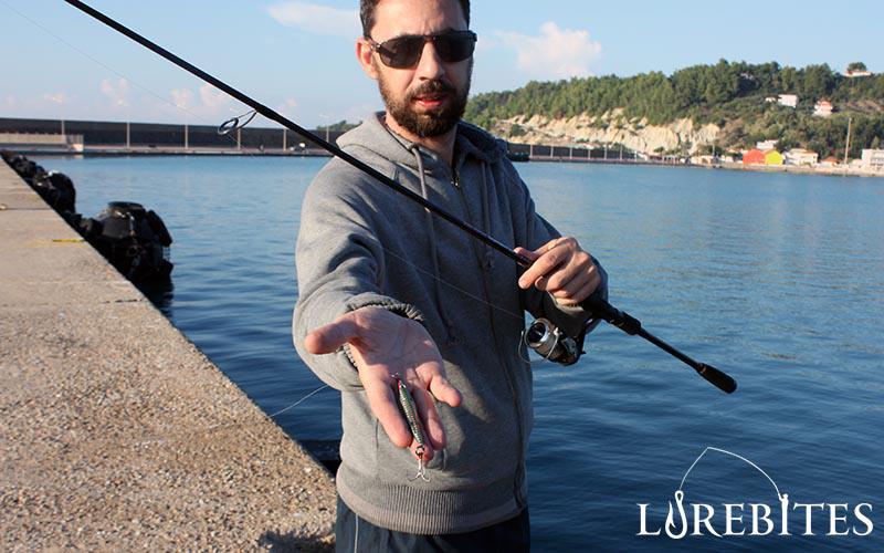 Πρώτα θα αναφερθώ στο αισθητικό κομμάτι όπου η λιτή εμφάνιση του καλαμιού χωρίς φανταχτερές λεπτομέρειες, με το ανθρακί χρώμα και την σπιράλ πλέξη του carbon να κυριαρχεί, ίσως ξενίσει πολλούς που ζητάνε περισσότερα για ένα καλάμι αυτής της χρηματικής αξίας. Προσωπικά αυτή η διακριτική εμφάνιση μου αρέσει αρκετά, αποδεικνύοντας ότι το απλό πολλές φορές είναι και όμορφο. Η λαβή είναι εργονομική και διαθέτει EVA καλής ποιότητας που προσφέρει σίγουρο κράτημα. Μοναδική ένσταση το μήκος του butt που για τα γούστα μου ήταν ελαφρώς μακρύτερο και δυσκόλευε ελαφρώς τον χειρισμό. Τώρα όσον αφορά την αίσθηση κατά το ψάρεμα, αρχικά να αναφέρω ότι βρισκόμουν σε λιμάνι με βάθος περίπου 10 μέτρα, και το ύψος που χώριζε το τσιμέντο του ντόκου με την επιφάνεια της θάλασσας να είναι περίπου τρία μέτρα. Χρησιμοποίησα αποκλειστικά σιλικονούχα δολώματα με μικρού βάρους jighead που δεν ξεπερνούσαν τα 15 γραμμάρια.