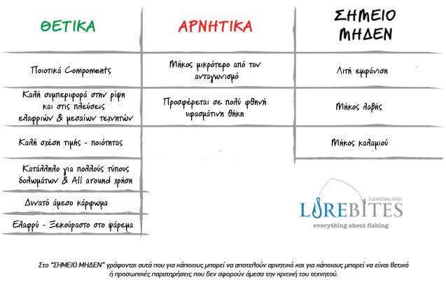 Όλα τα compoments του καλαμιού είναι άριστης ποιότητας και στο θέμα της εργονομίας, το μόνο που δίχασε λίγο ήταν το μήκος της λαβής που η αλήθεια είναι ότι θα πρόσφερε μεγαλύτερη άνεση στα τινάγματα αν ήταν ελάχιστα μικρότερο. Όμως σε ένα all around καλάμι, όπως αυτό, το θέμα της λαβής είναι υποκειμενικό και η αλήθεια είναι ότι το καλάμι είναι πολύ καλά ζυγισμένο οπότε μετά από μερικά ψαρέματα η λαβή γίνεται... ένα με το χέρι μας! Στο θέμα της εμφάνισης, αυτό που μπορούμε να πούμε είναι ότι επαφίεται στην αισθητική του καθενός οπότε είναι δικαιολογημένη κάθε άποψη. Προσωπικά, μου αρέσει το καλάμι να ξεχωρίζει με την custom εμφάνιση του, γι αυτό και του έβαλα σχετικά υψηλή βαθμολογία. Η σχέση τιμής-ποιότητας του καλαμιού πιστεύω ότι είναι πολύ τίμια -αν αναλογιστεί κανείς και την ειδική τιμή γνωριμίας των 300 ευρώ- και το μόνο που θα γίνει πολύς λόγος από εδώ και κάτω είναι το θέμα του μήκους γιατί αυτό είναι που θα επηρεάσει σε μεγαλύτερο ποσοστό την απόφαση κάποιου να το αποκτήσει.
