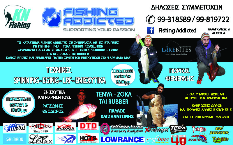 Ένα διήμερο γεμάτο γνώση για το ψάρεμα προσφέρει σε όλους του Κύπριους το κατάστημα ειδών αλιείας "Fishing Addicted" που βρίσκεται στην 8str Καλλιπόλεως στην Λευκωσία! Το event θα λάβει μέρος στο κατάστημα στις 1 και 2 Μαρτίου και αφορά ένα κύκλο σεμιναρίων για τις σύγχρονες τεχνικές ψαρέματος από την ακτή και το σκάφος.