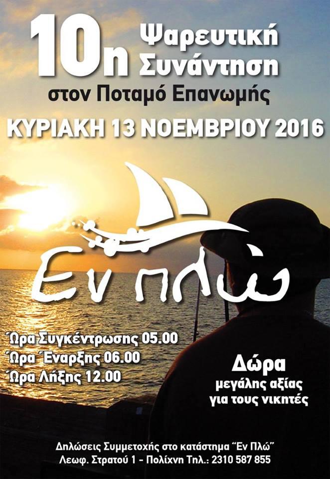 Στις 13 του Νοέμβρη θα διεξαχθεί η δέκατη ψαρευτική συνάντηση για casting του καταστήματος “Εν πλω” στην ποταμό Επανωμής με έναρξη στις 06:00 και λήξη στις 12:00. Στον αγώνα θα δοθούν πλούσια δώρα στους νικητές!