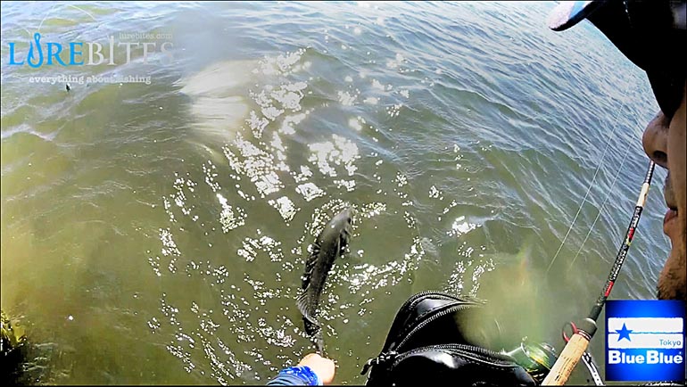 Indeed having travelled for so long without results, in a cast a big sea bass followed SNECON without striking it. In the next one the sea bass stroke it in a fierce way and it got caught. It gave me a very beautiful fight but i will stand in the beauty of the picture that played at that moment in front of my eyes. One of the most beautiful moment a spinner can live it's when you suddenly see an explosion on the surface with the sea bass coming out all the way out of the water having the lure in the mouth. After immortalizing it by taking some pictures, i released it as a reward for this magical moment that gave me.