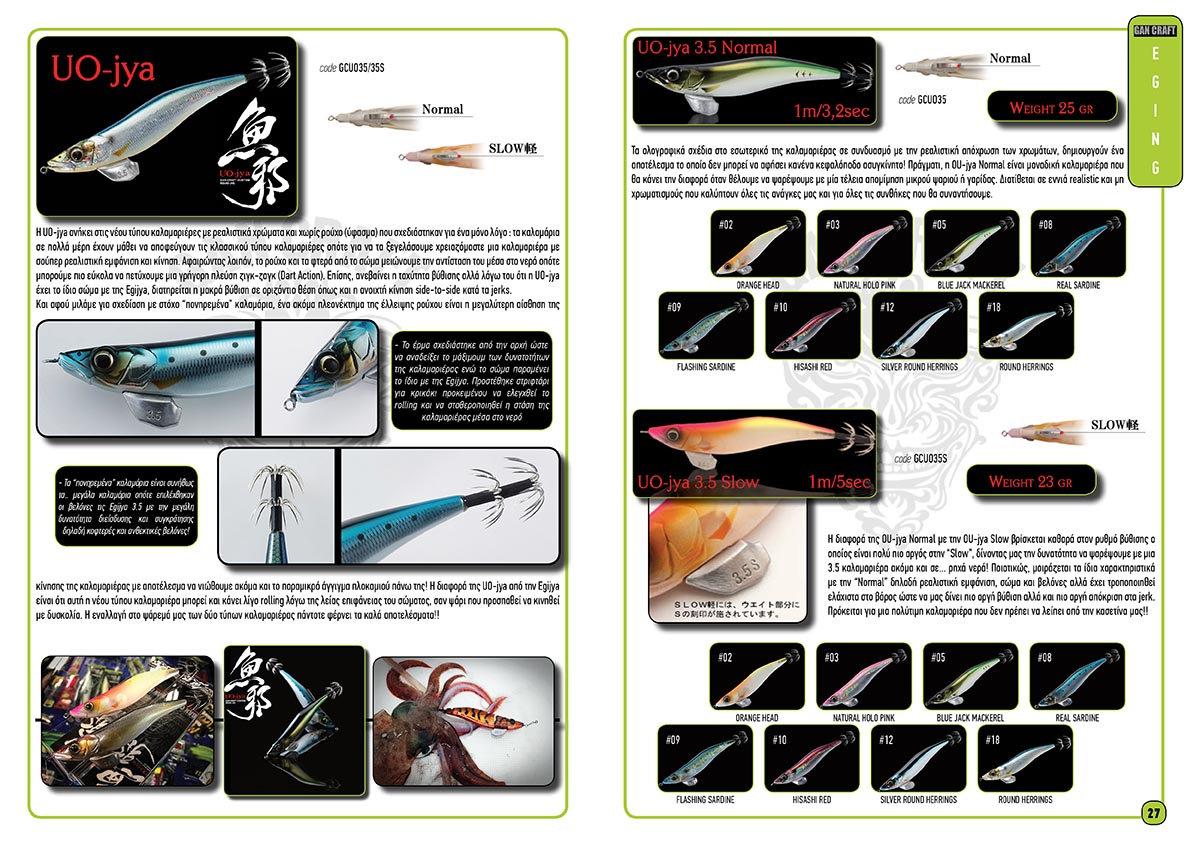 Αφαιρώντας λοιπόν, το ρούχο και τα φτερά από το σώμα μειώνουμε την αντίσταση του μέσα στο νερό οπότε μπορούμε πιο εύκολα να πετύχουμε μια γρήγορη πλεύση ζιγκ-ζαγκ (Dart Action). Επίσης, ανεβαίνει η ταχύτητα βύθισης αλλά λόγω του ότι η UO-jya έχει το ίδιο σώμα με της Egijya, διατηρείται η μακρά βύθιση σε οριζόντιο θέση όπως και η ανοιχτή κίνηση side-to-side κατά τα jerks. Θα την βρείτε σε ένα μέγεθος #3.5 και σε δύο τύπους Normal & Slow.