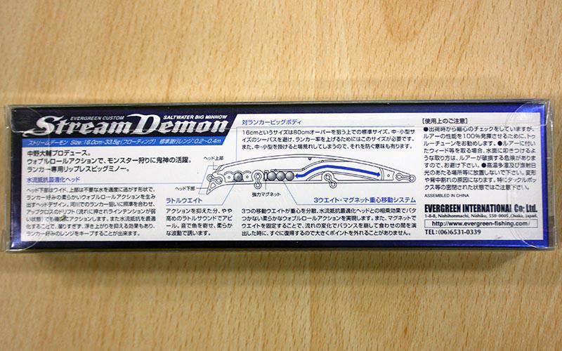 Κατ' αρχάς το τεχνητό ανήκει στην κατηγορία των lipless minnow, με μήκος 16 εκατοστά, βάρους 33.5 γραμμαρίων, floating πλευστότητας με το εύρος βάθους που πλέει να κυμαίνεται μεταξύ 20 και 40 εκατοστών. Τα lipless minnow είναι σχεδιασμένα και ευρέως διαδεδομένα στην Ιαπωνία για ψάρεμα σε ρηχές παραλίες ή σε εκβολές ποταμών με στόχο κυρίως το λαβράκι. Στην χώρα μας εκτός από το λαβράκι μπορεί να ψαρευτεί και με στόχο το γοφάρι, τον λούτσο καθώς και πελαγίσια αρπαχτικά. Το Stream Demon θα το βρείτε σε δύο διαθέσιμους χρωματισμούς με τους κωδικούς #767 και #773
