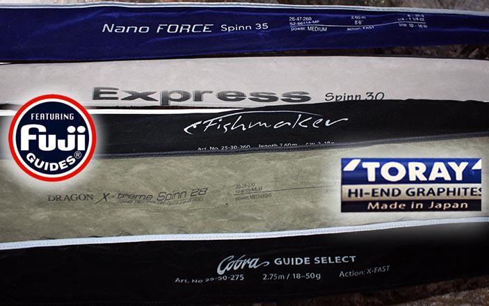 Όσον αφορά τα καλάμια έχουμε στην διάθεση μας τα μοντέλα Fishmaker jig, Express Spinn, Guide Select Cobra και τα ολοκαίνουργια NanoForce Spinn και X-treme Spinn! Για το καθένα ξεχωριστά θα κάνουμε εκτενή παρουσίαση αλλά σαν πρώτη εντύπωση οφείλουμε να ομολογήσουμε ότι βρήκαμε πολλές καινοτομίες αλλά και... γιαπωνέζικη ποιότητα! Ειδικά τα καινούργια μοντέλα έχουν κατασκευαστεί με την βοήθεια της επιστήμης της νανοτεχνολογίας από τον ιαπωνικό κολοσσό Toray ενώ και οι οδηγοί καθώς και η βάση μηχανισμού είναι της γνωστής σε όλους μας, ιαπωνικής εταιρείας Fuji.