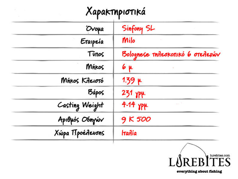 Στην δική μας παρουσίαση διαλέξαμε από το μοντέλο Sinfony την έκδοση SL με μήκος έξι μέτρα το οποίο είναι το πιο all around καλάμι για τα δικά μας νερά. Σαν σκληρότητα, η εταιρεία το προτείνει ως “Medium Strong” (αναγράφεται και πάνω στο blank) που βοηθάει ακόμα και αν θέλουμε να το ψαρέψουμε με φελλούς του εγγλέζικου.