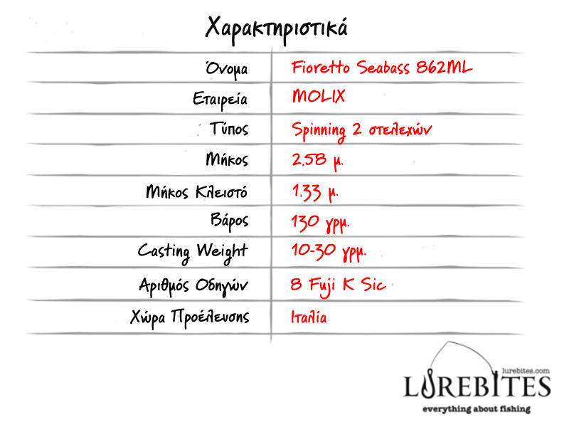 Η Ιταλική Molix, εταιρία που είναι γνωστή κυρίως από την κατασκευή τεχνητών δολωμάτων, μέσα στην πραγματικά μεγάλη γκάμα των προϊόντων της, διαθέτει και κάποιες επιλογές στην κατηγορία των καλαμιών spinning. Το ενδιαφέρον μας τράβηξε η σειρά με την ονομασία Fioretto που αποτελεί και την κορυφαία πρόταση της εταιρίας σε αυτή τη κατηγορία. Ο λόγος που τράβηξε την προσοχή μας ήταν το μοντέλο 862ML που σύμφωνα με την εταιρία είναι ένα καθαρόαιμο seabass καλάμι.