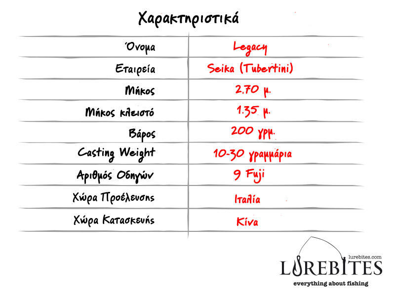 Άρα, το αμέσως επόμενο βήμα είναι η αγορά του κατάλληλου εξοπλισμού που να ανταποκρίνεται στις απαιτήσεις και τις ανάγκες της τεχνικής. Όμως αφού μιλάμε για αρχικό εξοπλισμό που θα μας εισάγει στην τεχνική, το κόστος που θα τον συνοδεύει θα πρέπει να είναι όσο το δυνατόν χαμηλότερο. Αυτόν τον γρίφο που βασανίζει πολλούς “επίδοξους spinners” έρχεται να βοηθήσει η παρούσα παρουσίαση που αφορά το καλάμι της εταιρίας Seika με το όνομα Legacy που έρχεται να αφήσει την δική του... “κληρονομιά” στις οικονομικές σειρές καλαμιών spinning! Ας ρίξουμε όμως μια ματιά στα χαρακτηριστικά του καλαμιού...