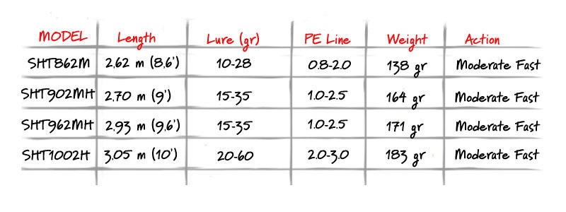 SHT 1002H (Hea : με μήκος 3.05m (1.56m κλειστό), μονής στήριξης οδηγούς, lure weight 20-60 γραμμάρια, PE 2.0 - 3.0, δράση κορυφής moderate fast και βάρος μόλις 183gr! Πρόκειται για μία επιλογή για heavy spinning καταστάσεις, ικανό να τα βάλει επάξια ακόμα και με τα "τέρατα της θάλασσας", τα ψάρια "τρόπαια". Πλανάκια μέχρι 55 γραμμάρια τα εξαφανίζει στον ορίζοντα, τεχνητά από 17 έως 50 γραμμάρια τα χειρίζεται άψογα ενώ τις σιλικόνες από 20 έως 55 γραμμάρια τις... ζωντανεύει!