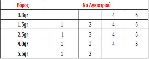 Τέλος, αυτό που το κάνει απαραίτητο στο LRF είναι η μεγάλη ποικιλία σε μεγέθη αγκιστριών στο ίδιο βάρος jighead ώστε να μπορούμε να ψαρέψουμε όλα τα μικρά και μεσαία softbaits. Στο παρακάτω πίνακα μπορείτε να δείτε την μεγάλη ποικιλία :