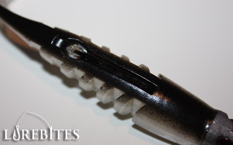 Ένα άλλο θετικό είναι ότι η σιλικόνη είναι καλά κολλημένη πάνω στο jighead και επίσης ακόμη καλύτερο είναι το γεγονός ότι υπάρχει ένα μικρό στόπερ πάνω στην κούρμπα του αγκιστριού ώστε να μην φεύγει η σιλικόνη από την θέση της, όσο δυνατά jerk και αν κάνουμε.