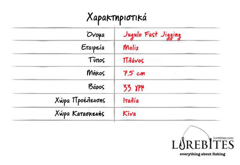 H Molix είναι μια Ιταλική εταιρία που μετρά αρκετά χρόνια στην παραγωγή ειδών αλιείας, με ιδιαίτερη έμφαση στην σχέση ποιότητας-τιμής. Θέλει να προσφέρει δηλαδή ποιοτικά προϊόντα χωρίς όμως να ξοδεύουμε μια περιουσία για την απόκτησή τους. Ένα από αυτά τα προϊόντα είναι και οι πλάνοι Jugulo που ήρθαν στα χέρια μας. Τα δυο μοντέλα που θα μιλήσουμε είναι ο Jugulo casting jig στα 40 γρμ. και ο Jugulo fast sinking στα 33 γρμ..