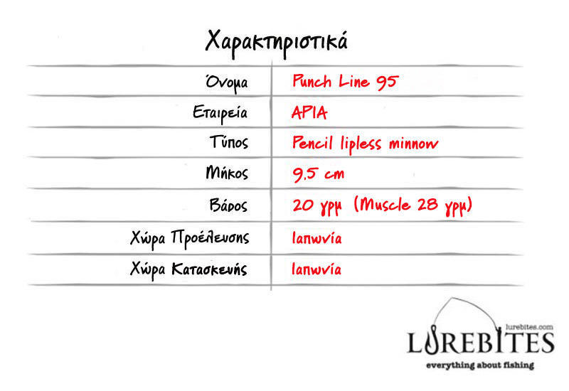Αρχίζοντας την περιγραφή θα λέγαμε οτι η εξωτερική εμφάνιση μεταξύ των δύο μοντέλων (95 & 95 Muscle) είναι απολύτως η ίδια, δεν αλλάζει κάτι. Η βασική διαφορά τους, που αυτόματα τα κατατάσσει σε δυο διαφορετικά μοντέλα θα την διακρίνουμε αμέσως αφού αναφέρουμε τα χαρακτηριστικά τους. Το Punch Line 95 ανήκει στην κατηγορία των lipless pencil minnow με sinking πλευστότητα.