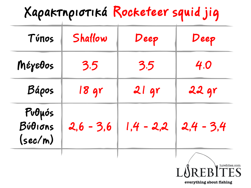 Η Rocketeer παράγεται σε διάφορα μεγέθη και σε ποικιλία χρωμάτων αλλά στην χώρα μας διατίθεται προς το παρόν σε συγκεκριμένα μεγέθη και χρώματα που θα καλύψουν κάθε βασική ανάγκη. Επίσης η καλαμαριέρα αυτή παράγεται σε δυο εκδόσεις : την έκδοση shallow που προορίζεται για ψάρεμα σε φυσιολογικά βάθη και την έκδοση deep που βρίσκει εφαρμογή στα πολύ μεγάλα βάθη και σε ψάρεμα από βάρκα. Στην χώρα μας θα βρείτε και τις δυο εκδόσεις.