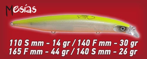 Το τεχνητό Mesias ήρθε για να... "μας σώσει" στην αναζήτηση μας για τα μεγάλα λαβράκια! Ένα μεσαίο minnow καθαρά για το ψάρεμα του λαβρακιού σε όλες τις συνθήκες, από την μπουνάτσα μέχρι την φουρτούνα, από την παραλία μέχρι τα βράχια!! Για να επιτευχθεί όμως αυτό, η εταιρεία μας το προσφέρει σε τέσσερις εκδόσεις με διαφορετικά χαρακτηριστικά ώστε να μπορούμε να επιλέξουμε εμείς πιο είναι αυτό που θα μας κάνει ανάλογα το περιβάλλον και τις συνθήκες που ψαρεύουμε.