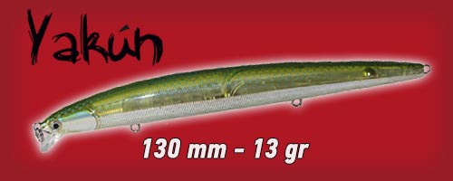 Το Yakun είναι η πρόταση της εταιρείας στα slim minnows... Με μήκος 130 mm και βάρος μόλις 13 gr, εντυπωσιάζει με την σφιχτή rolling πλεύση του μέσα στο νερό! Ένα πολύ χρήσιμο τεχνητό σε συνθήκες που τα ψάρια είναι καχύποπτα και ειδικά όταν υπάρχουν ζαργάνες στο νερό.