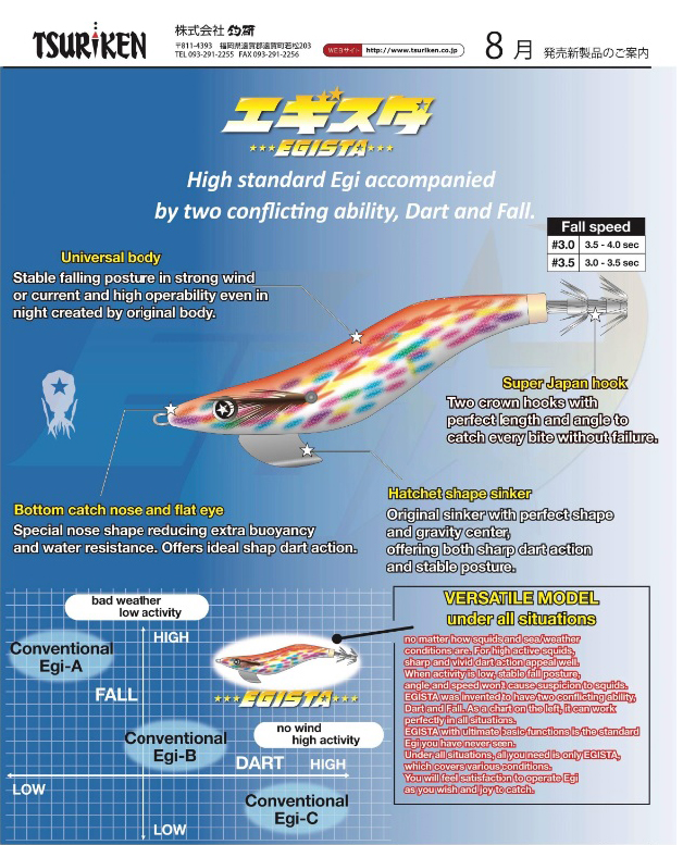 Αυτό ακριβώς ήρθαν να μας προσφέρουν οι Egista : ιαπωνική ποιότητα σε ιδιαίτερα ελκυστική τιμή! Τα μεγέθη που θα την βρείτε είναι #3.0 & #3.5 και σε τέσσερις διαφορετικές εκδόσεις για τις οποίες θα μιλήσουμε πιο κάτω αναλυτικά. Η κατασκευάστρια εταιρεία Tsuriken υιοθετεί την φιλοσοφία του αρμονικού συνδυασμού της Dart και Fall action και όπως φαίνεται και από τον παρακάτω πίνακα μας παροτρύνει να δουλεύουμε την καλαμαριέρα μας: