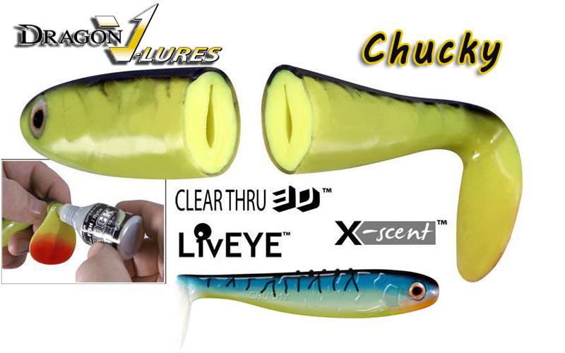 Το Chucky είναι ένα σιλικονούχο δόλωμα νέας τεχνολογίας και ανήκει στην κατηγορία των Shads. Σχεδιασμένο να μοιάζει με ψάρι και με ανάγλυφο σώμα του ClearThru3D ™ (ειδικό βερνίκι που δίνει πραγματικά ρεαλιστική υφή) το οποίο είναι κούφιο εσωτερικά για να δίνει περισσότερη φωτεινότητα, δεν θα αφήσει κανένα αρπαχτικό αδιάφορο! Επίσης μας δίνει την δυνατότητα γεμίσματος με άρωμα Shock Bite το οποίο αφήνει κατά την πλεύση στο νερό ώστε να προσελκύσει τα ψάρια με την μυρωδιά. Έχει μάτια με τρισδιάστατη τεχνολογία LivEYE και τα μεγέθη που θα το βρείτε είναι 7,5cm, 10cm και 12,5cm σε συσκευασίες των 5 τεμαχίων.