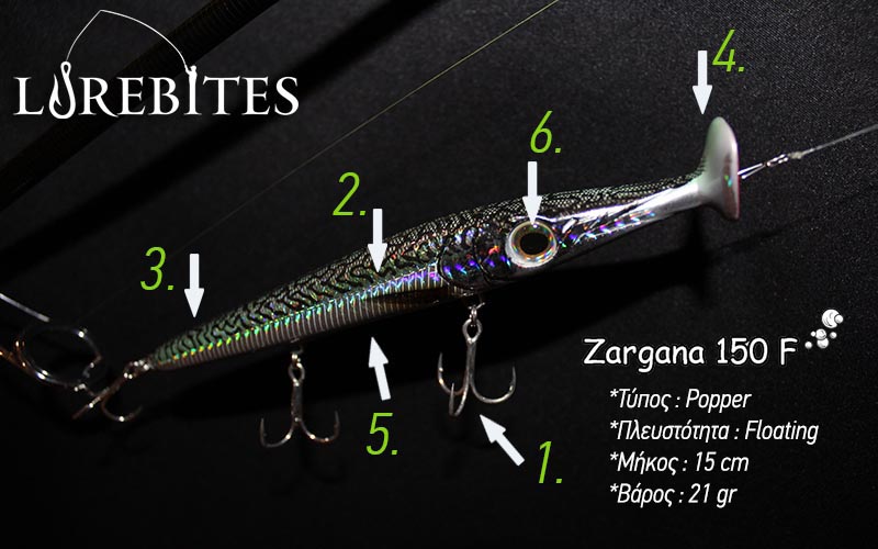 4. Καινοτόμο τετραγωνισμένο στόμιο, μοναδικό στον κόσμο που μπορεί να δημιουργεί μεγάλους πίδακες νερού με μεγάλη ευκολία, ακόμη και με αργή ανάκτηση 5. Σώμα που παραπέμπει στο bait fish ζαργάνα με ανάγλυφα λέπια και πιστές λεπτομέρειες του κεφαλιού της