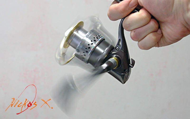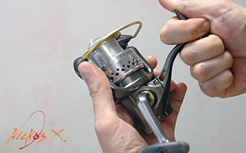 5. Ανεβάστε το bail, το οποίο θα πρέπει να είναι λίγο σφιχτό, προσέξτε αν κάνει θόρυβο σαν να έχει σκόνη μέσα. Συνεχίστε γυρνώντας τη μανιβέλα και προσέξτε αν πέφτει στην αρχική του θέση και όχι κάπου στα μισά. Πιάστε τον μηχανισμό με το ένα χέρι και με το άλλο τον ρότορα και προσπαθήστε, κουνώντας τον ελαφρά, να δείτε αν έχει «τζόγο».
