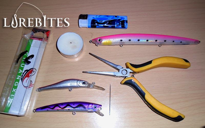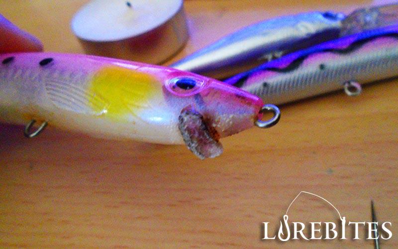 Για την επισκευή θα χρειαστούμε : 1) ένα κεράκι ρεσό 2) έναν αναπτήρα 3) ένα πενσάκι 4) μια βελόνα από τα ραφτικά της μαμάς (ή κάτι παρόμοιο) 5) 1-2 τεχνητά του 1 (ενός) ευρώ 6) τον "Ασθενή", που σε αυτήν την περίπτωση είναι το γνωστό σε όλους Rapala Max Rap 17cm το οποίο το κοπάνησα σε μερικά "βότσαλα"...