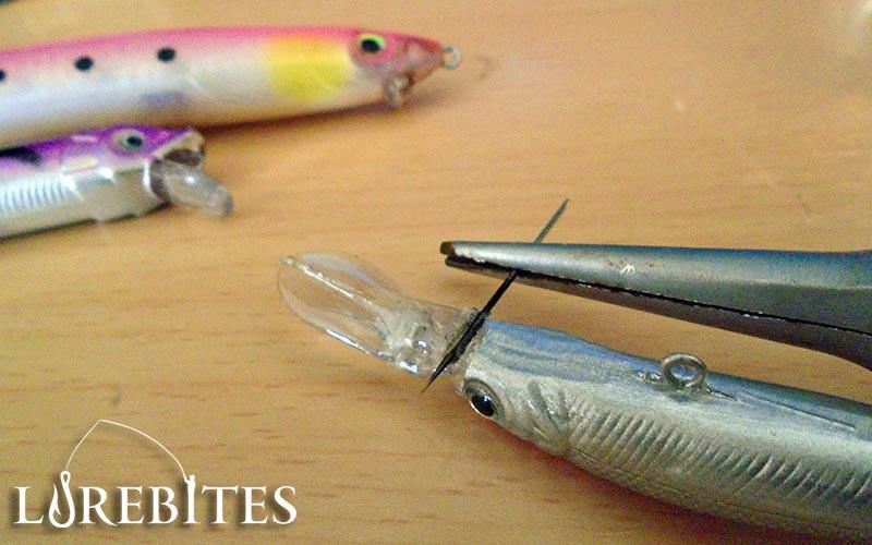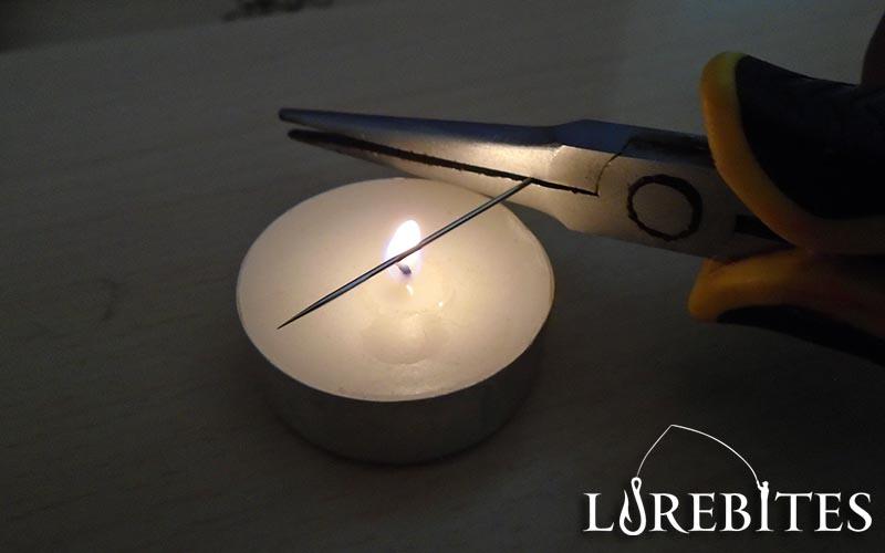 Επόμενο βήμα είναι να πυρακτώσουμε την βελόνα κρατώντας την πάντα με ένα πενσάκι προσεχτικά και αφού κοκκινίσει ξεκινάμε σιγά σιγά να ''πριονίζουμε'' την γλώσσα του φθηνού τεχνητού από την βάση της. Μόλις αρχίσει να κολλάει επάνω στο πλαστικό η βελόνα, την τραβάμε και την ξανά τοποθετούμε για λίγο πάλι στην φωτιά να πυρακτώσει και επαναλαμβάνουμε μέχρι να έχουμε μια ίσια κάθετη τομή. Στόχος μας είναι να αφαιρέσουμε την γλώσσα ατόφια και ακέραια.