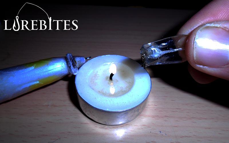 Τέλος ξανά ανάβουμε το κεράκι ρεσό και κρατώντας προσεκτικά το τεχνητό στο ένα χέρι και την γλώσσα στο άλλο, τα φέρνουμε κοντά στην φωτιά ώστε να αρπάξουν και να ρευστοποιηθούν τα πλαστικά. Αφού τα χουμε με την φωτιά προς τα επάνω ώστε να λιώσουν μόνο οι άκρες, φυσάμε να σβήσει η φλόγα και τα ενώνουμε προσεκτικά χωρίς πολύ δύναμη.