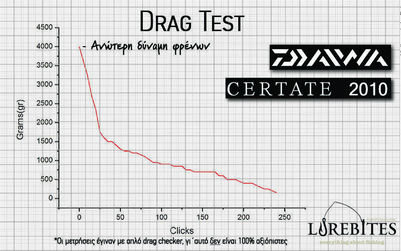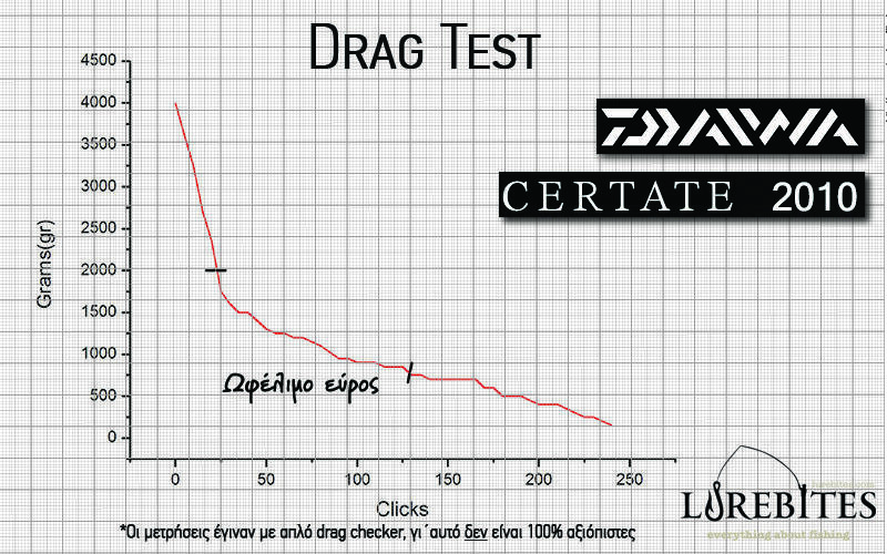 Άλλα πράγματα που μπορούμε να διαβάσουμε από το γράφημα είναι το εύρος των ωφέλιμων ρυθμίσεων της πεταλούδας και κατ’ επέκταση των φρένων. Με πιο απλά λόγια, αν πάρουμε τις μετρήσεις μας και δούμε ότι οι δυνάμεις αλλάζουν σε διάστημα π.χ. τριών στροφών του μηχανισμού από τις έξι που διαθέτει, τότε καταλαβαίνουμε αυτόματα ότι στο ψάρεμα έχουμε τρεις στροφές για την πάλη με το ψάρι. Τι συμβαίνει στις άλλες τρεις; Μπορεί να είναι μοιρασμένες π.χ. σε μια όπου τα φρένα παραμένουν συνέχεια στην ανώτερη δύναμη και σε άλλες δύο όπου η δύναμη είναι μηδενική δηλαδή κοινώς : τα φρένα είναι τελείως λυτά. Για να πάρετε μια ιδέα, μέτρησα τα φρένα ενός παλιού μηχανισμού μου του Daiwa Certate 3000 του 2010 και έφτιαξα ένα γράφημα. Ο μηχανισμός αυτός (και σχεδόν όλοι οι Daiwa μηχανισμοί) έχει 60 clicks σε μια πλήρη περιστροφή της πεταλούδας. Στο γράφημα βλέπουμε ότι τα ωφέλιμα φρένα βρίσκονται περίπου σε δύο περιστροφές της πεταλούδες. Τα υπόλοιπα είτε είναι σχεδόν μηδενικά ή πολύ σφιχτά.
