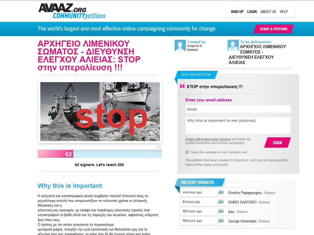 Με ιδιωτική πρωτοβουλία διενεργείται ψήφισμα για το μεγάλο θέμα της υπεραλίευσης στην χώρα μας μέσω του παγκόσμιου οργανισμού "Avaaz", το οποίο θα παραδοθεί στο Αρχηγείο Λιμενικού Σώματος και συγκεκριμένα στην Διεύθυνση Ελέγχου Αλιείας.