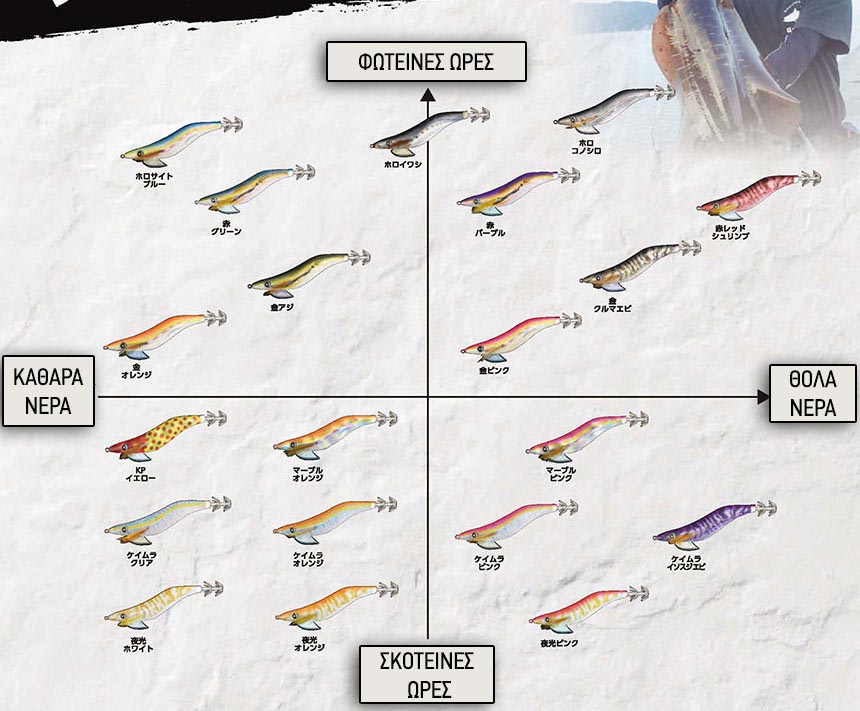 Χρησιμότατο είναι το πλάνο της Tsuriken που μας κατευθύνει στην επιλογή χρωματισμού ανάλογα την φωτεινότητα του περιβάλλοντος όπως π.χ. αν έχουμε να κάνουμε με θολά νερά ή καθαρά. Σας το μεταφράσαμε από τα Ιαπωνικά ώστε να σας βοηθήσει στην επιλογή σας! Κάθε τεταρτημόριο περιέχει τους πιο κατάλληλους χρωματισμούς στις αντίστοιχες συνθήκες φωτεινότητας εξωτερικού περιβάλλοντος και νερού.