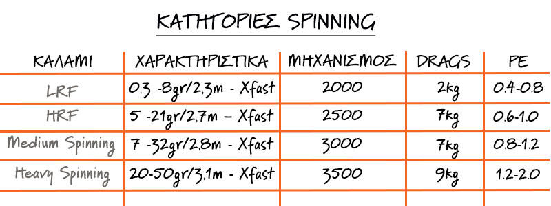 Ο αριθμός των συνδυασμών που προτάθηκαν παραπάνω, ξεκινούν από casting weight ελάχιστων γραμμάριων και προοδευτικά και χωρίς προπάντων κενά, φτάνουν στα 50 γραμμάρια που θεωρώ το ανώτερο όριο για την τεχνική του spinning.