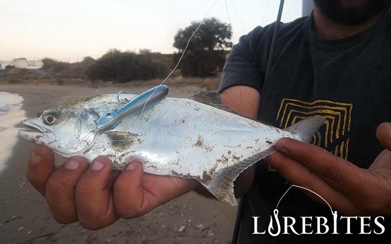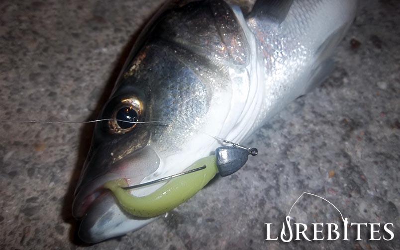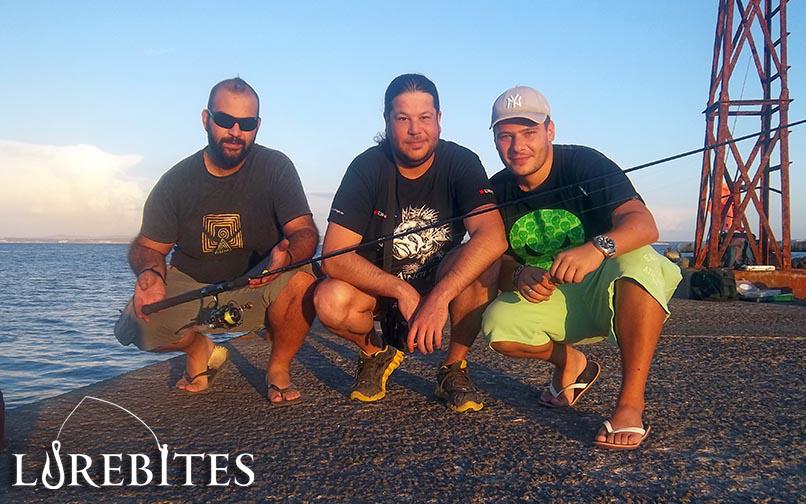 Αποφάσισα να πάω να κάνω μια ρίψη σε εκείνο το σημείο. Περασμένη στην παραμάνα μου ήταν μια μικρή σιλικονίτσα " Shimatsu- Drop fish" σε μέγεθος 3" , χρώμα ροζ, σχήμα ψαριού με διχαλωτή ουρά σε συνδυασμό με ένα jighead 7 γρμ. με σχήμα κεφαλιού ζαργάνας το οποίο της έδινε ένα ωραίο-αργό κατέβασμα στον βυθό. Με την πρώτη ρίψη μόλις ένιωσα την σιλικόνη μου να προσγειώνεται στον βυθό, ήρθε το χτύπημα από το λαβράκι. Κάρφωσα ακαριαία με αποτέλεσμα να πιάσω ένα όμορφο λαβράκι. Ήρθαν τα παιδιά κατευθείαν να με βοηθήσουν με το απόχιασμα. Βγάλαμε μια αναμνηστική φωτογραφία και απελευθερώσαμε το μικρό αλλά μαχητικό λαβράκι. Πίσω από αυτό όμως, ακολουθούσαν μερικά ακόμα του ίδιου μεγέθους.