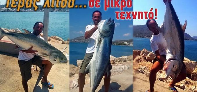 Ο Ανδρέας δεν είναι χθεσινός στο spinning και ήξερε ότι για να το σταματήσει το ψάρι θα έπρεπε να αναλάβει τον ρόλο των φρένων που σημαίνει ότι θα έβαζε το χέρι στην μπομπίνα και μαλακά θα βοηθούσε τα φρένα να σφίξουν τόσο ώστε να μην ανοίξουν οι σαλαγκιές. Το τεχνητό άλλωστε ήταν μικρό για τέτοιο ψάρι και το 0,28 mm παράμαλλο δεν ήταν για πολλά ζόρια. Κάποια στιγμή η λίτσα σταμάτησε και έκανε το ολέθριο λάθος να γυρίσει προς την μπούκα του λιμανιού, επιτρέποντας στον Ανδρέα να μαζέψει αρκετά μέτρα νήμα... χοροπηδώντας από βράχο σε βράχο με τις σαγιονάρες!! Μέχρι εκείνη την στιγμή δεν περίμενε ότι είχε πιθανότητες να δει το ψάρι στον ντόκο οπότε αποφάσισαν να τραβήξουν βίντεο για να έχουν να θυμούνται... Τελικά μετά από περίπου είκοσι λεπτά και... δύο κινητά βίντεο, η μεγάλη λίτσα παραδόθηκε! Το ψάρι ζυγίστηκε και ήταν 23,500 κιλά ενώ οι σαλαγκιές του τεχνητού κράτησαν σχεδόν μέχρι το τέλος χωρίς να ανοίξουν. Ήταν από αυτά που δεν συμβαίνουν συχνά και ανεβάζουν πολύ ψηλά το πήχη!