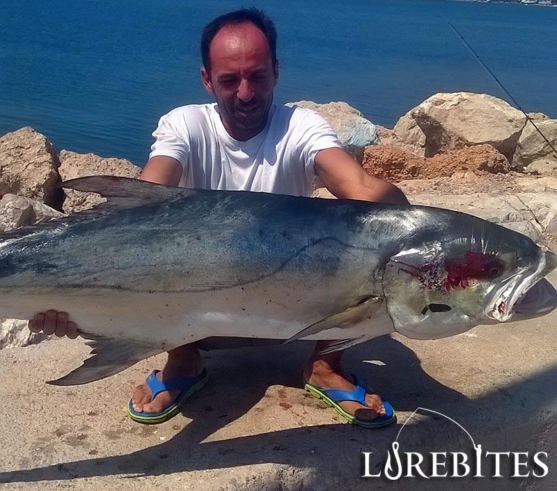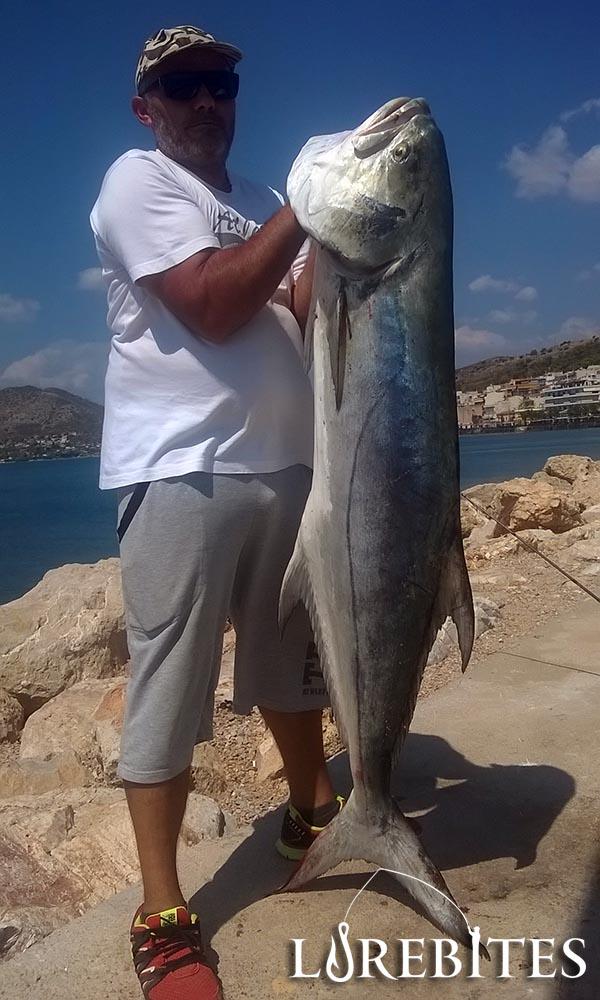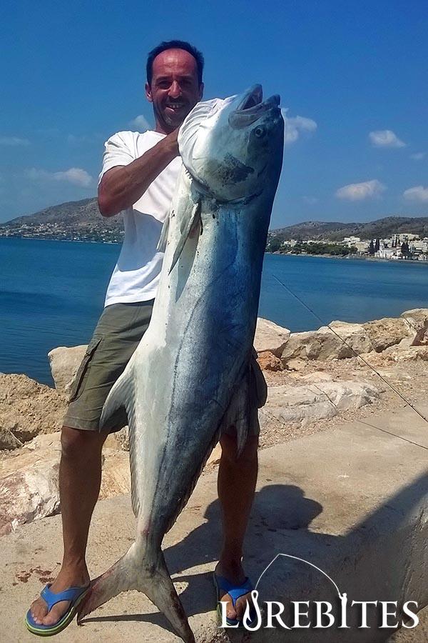 Ο Ανδρέας είχε πάει σε ένα λιμάνι μαζί με τον φίλο του τον Τρύφωνα, για να αναζητήσουν λαβράκια. Όταν έφτασαν, διάλεξε να μην βγάλει το καλάμι για λαβράκια που είχε με c.w. 5-21 γρμ. αλλά να χρησιμοποιήσει το πιο δυνατό καλάμι "μπαλαντέρ" που είχε, γιατί ήθελε να ψαρέψει με μεγάλα τεχνητά είκοσι εκατοστών. Από τις πρώτες ρίψεις, η επιλογή του τον δικαίωσε αφού ένα καλό γοφάρι ξεγελάστηκε από το μεγάλο minnow. Ο Τρύφωνας στην συνέχεια πήρε ένα λαβράκι σε τεχνητό επιφανείας οπότε ο Ανδρέας σκέφτηκε να βγάλει το άλλο καλάμι για τα λαβράκια. Όμως για καλή του τύχη, αποφάσισε να δοκιμάσει με το 12-45 γρμ. να ρίξει το 95 τεχνητό του γιατί του φάνηκε ότι είδε κάποιο κυνήγι το οποίο θα χανόταν μέχρι να στήσει τον άλλο εξοπλισμό. Με σύμμαχο τον άνεμο, το Bay Ruf εκσφενδονίστηκε μακριά και μετά από τα πρώτα τινάγματα ένα "μπαμ" σταμάτησε την πλεύση του! Πρόλαβε να δει το ψάρι να γυρνάει και η φιγούρα του ήταν... τρομακτική!! Το πρώτο φευγιό ήταν ασταμάτητο και ευτυχώς που είχε στον μηχανισμό 350 μέτρα νήμα.